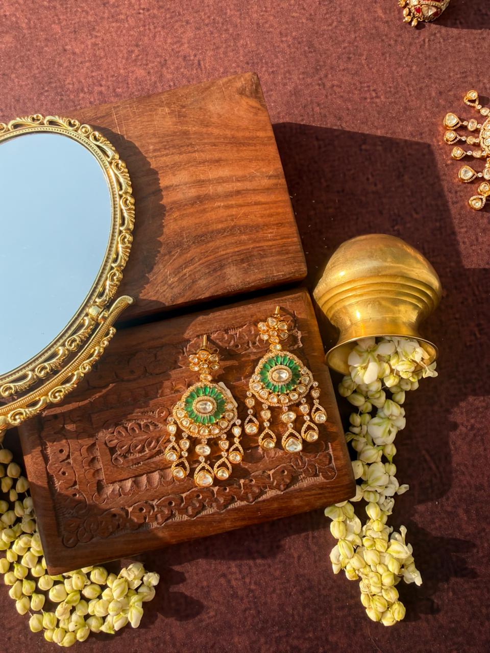 Regal kundan & polki work, crafted with premium quality champaigne moissanite stones and gold-look plating. Designed to look exactly like authentic bridal earrings.